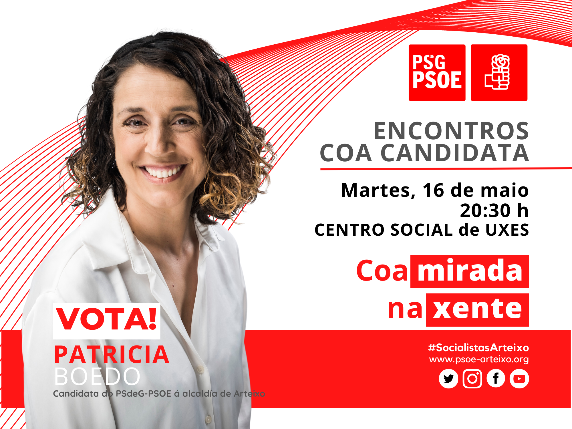 O martes 16 de maio , a candidata Patricia Boedo participará nun encontro coa veciñanza en Morás no Centro Social de Uxes ás 20:30